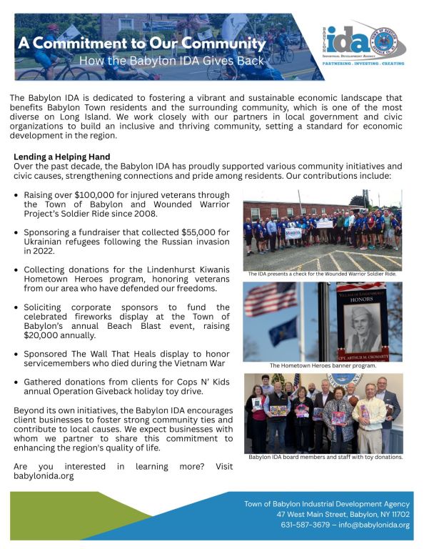 The Babylon IDA is dedicated to fostering a vibrant and sustainable economic landscape that benefits Babylon Town residents and the surrounding community, which is one of the most diverse on Long Island. We work closely with our partners in local government and civic organizations to build an inclusive and thriving community, setting a standard for economic development in the region.